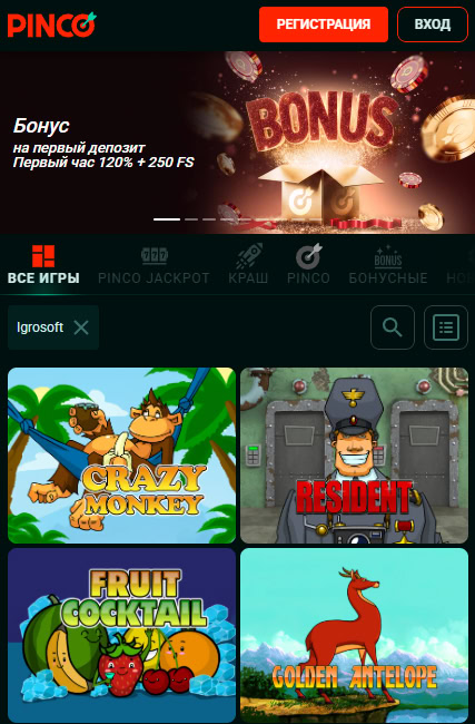 Главная страница официального сайта PINCO работает в адаптивном дизайне и загружается меньше чем за 2 секунды даже при слабом мобильном интернете. Навигация построена интуитивно: верхнее меню ведет в разделы со слотами, живым казино, турнирами и акциями. Боковая панель показывает топ выигрышей в реальном времени, центральная часть демонстрирует баннеры с актуальными бонусами и новинками игрового каталога.